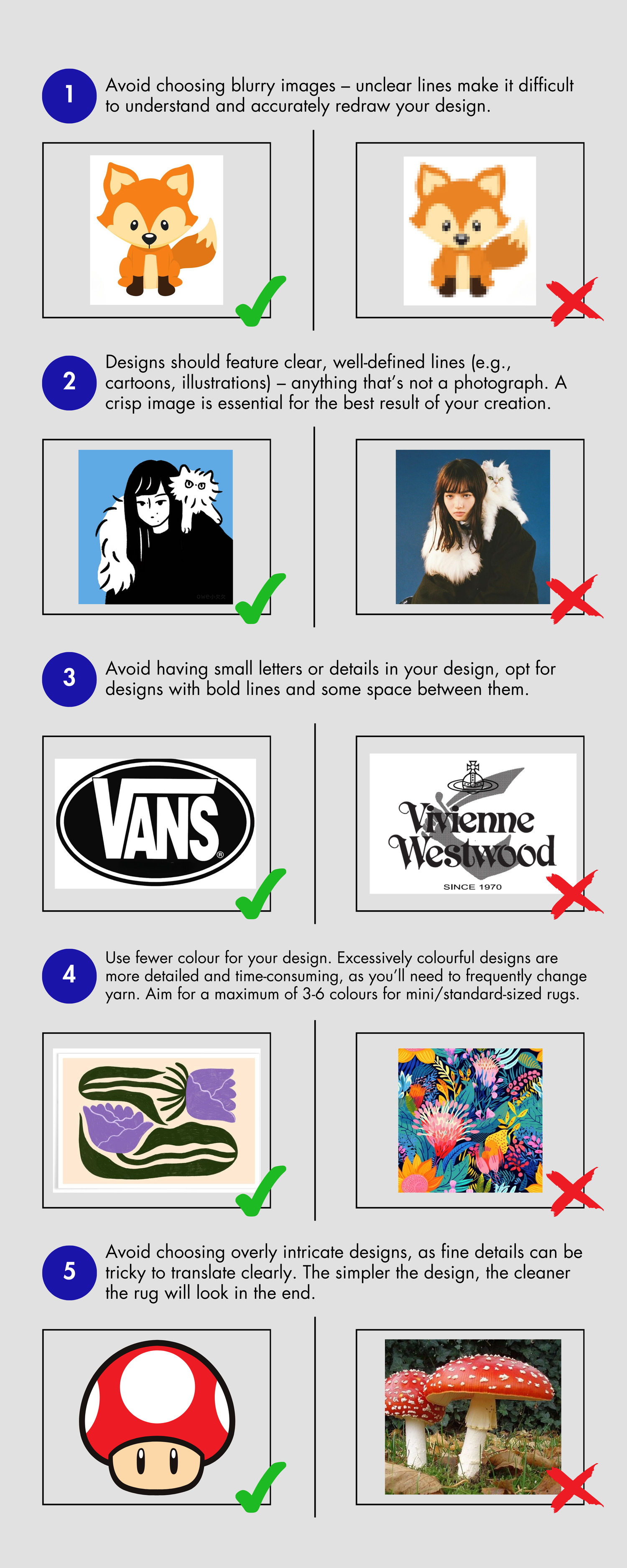 Our workshop options let you choose whatever design you prefer, if it fits within our design requirements (see the bottom of this page). However, to make sure your rug turns out amazing, keep it to 5 colours or less. Super tiny details and thin lines can be tricky, so something bolder will look best. Don't worry, we'll review your design after you submit it and offer any suggestions if needed. Check us our on Instagram for some serious inspo!